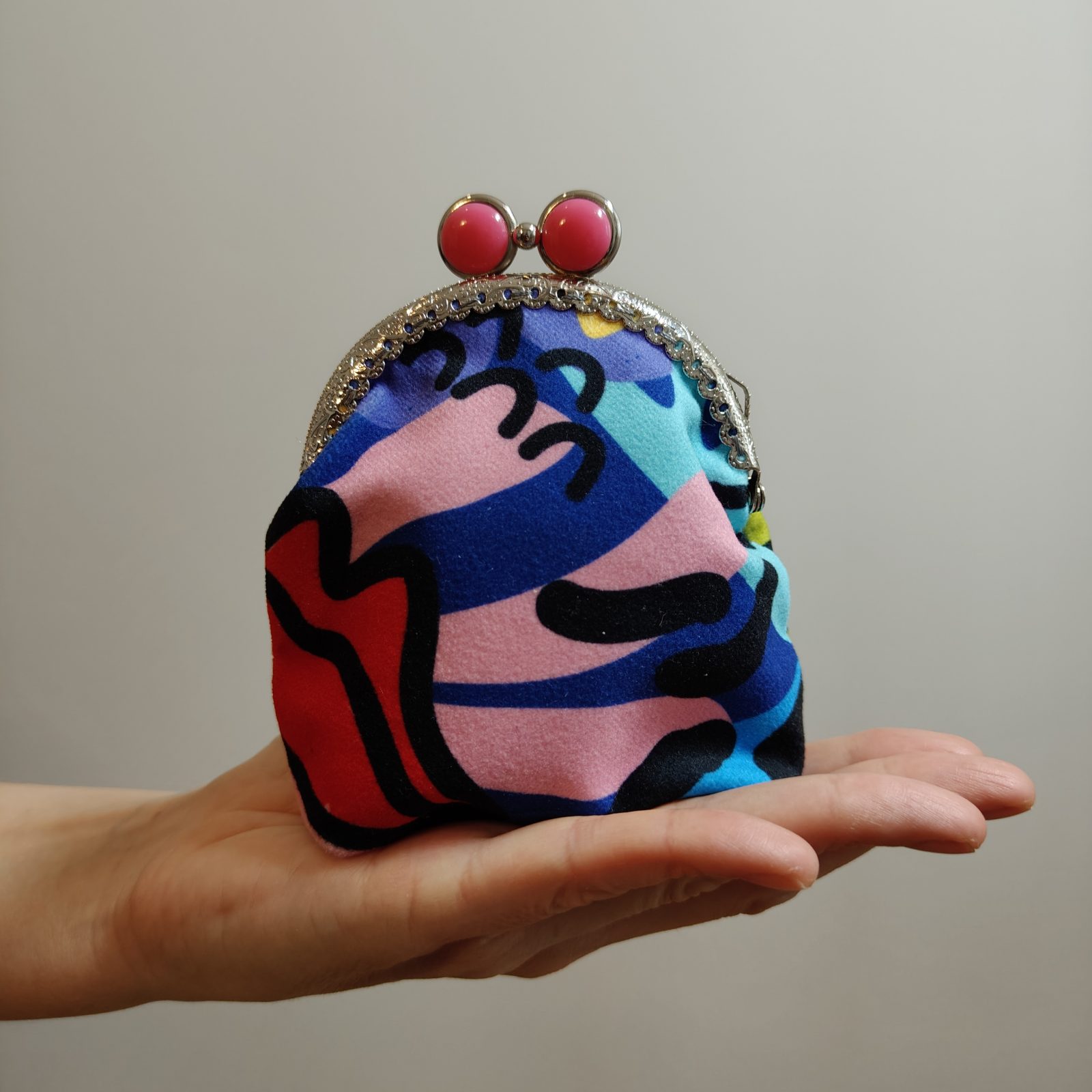 Portmonetka kolorowa z biglem. Uszyta z weluru, w środku szara podszewka. Wymiary w najszerszych miejscach: szerokość 9 cm, wysokość 10 cm