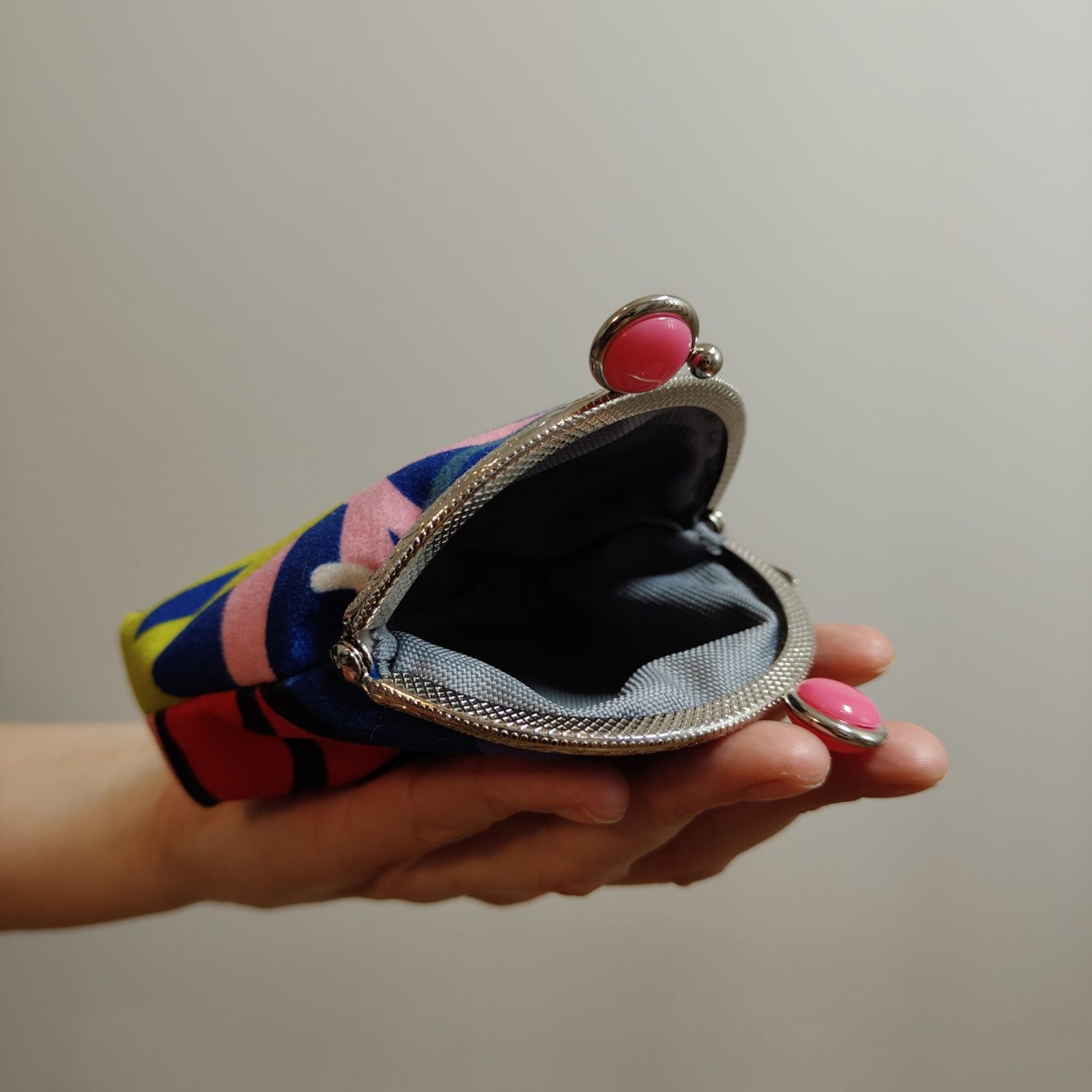 Portmonetka kolorowa z biglem. Uszyta z kordury, w środku szara podszewka. Wymiary w najszerszych miejscach: szerokość 9 cm, wysokość 10 cm